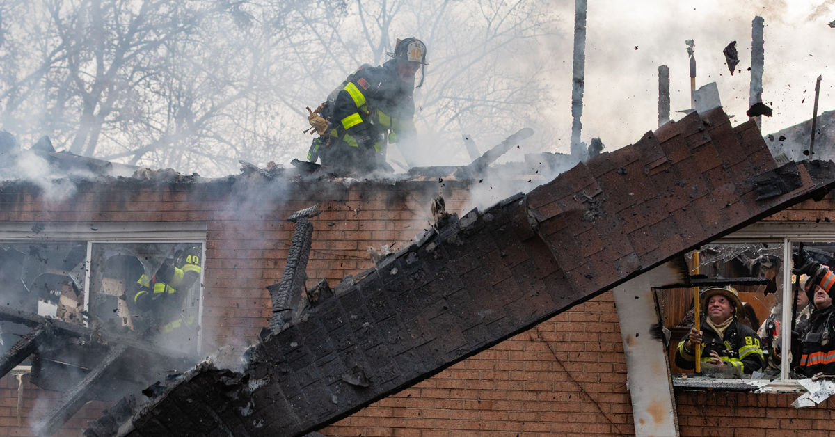 Firefighters from Granite Falls, Grace Chapel and Sawmills Fire Departments take down part of the roof burned at 4526 Hickory Boulevard in Granite Falls, NC. The Granite Falls Fire Department responded to the structure fire at 8:46 a.m. on Dec. 4, 2025.