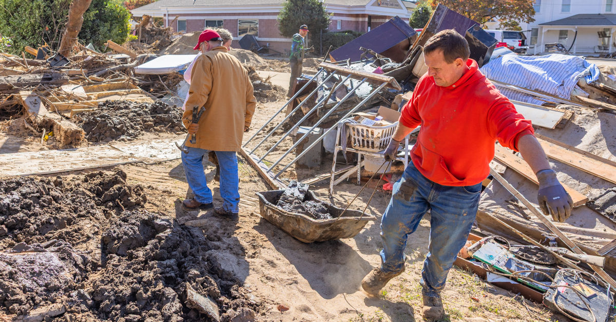 Gods Pit Crew member Mark Reitz, right, drags a sled full of mud out of Pearl Shelton’s house in Old Fort, NC on Oct. 16, 2024. Volunteers from Gods Pit Crew bussed in from as far as California, Mississippi, Texas, Pennsylvania, and Virginia to assist in cleanup efforts.